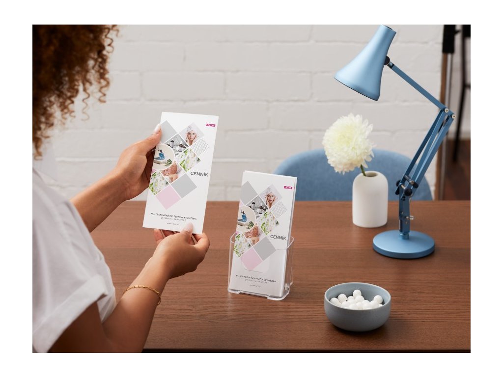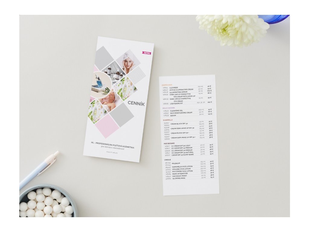 Profesionálne vytlačený B2C cenník značky HL vo formáte A3, zložený na 3 časti (tri-fold). Praktický „cenník-leták“, ktorý môžete umiestniť v salóne (recepcia, čakáreň, predajná zóna) a zároveň ho používať ako informačný materiál pre klienta – aby si ho mohol zobrať domov a pohodlne sa rozhodnúť.