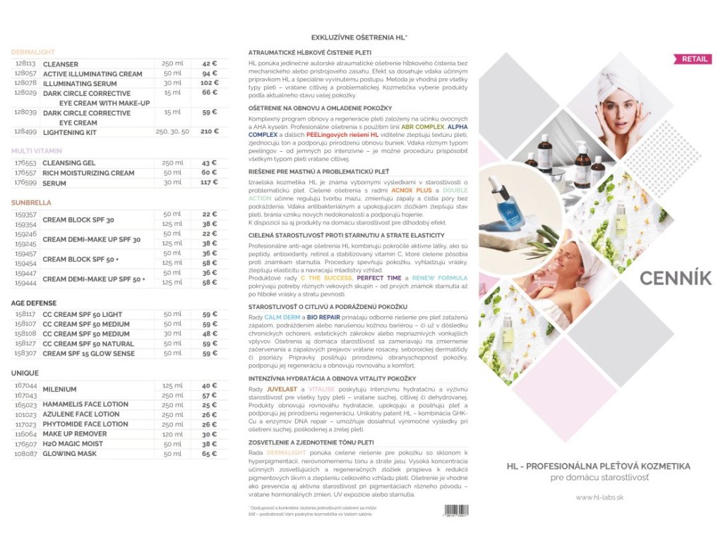 Na zadnej strane nájdete marketingovo spracovaný popis procedúr HL, takže cenník nie je len zoznam cien, ale aj mini prezentácia ošetrení a filozofie značky.